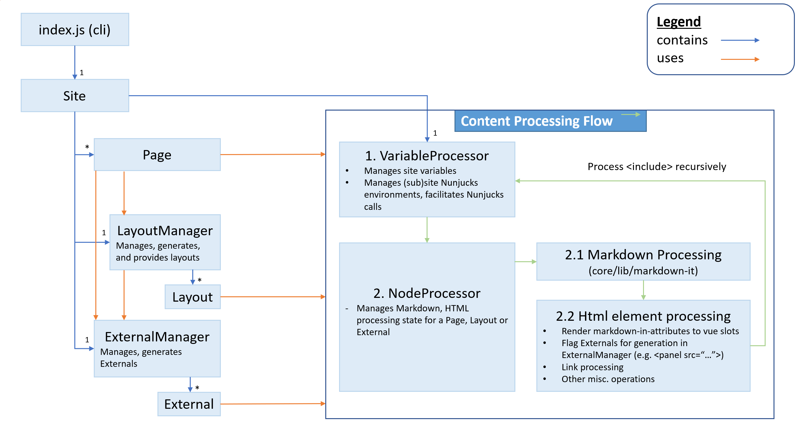 External — source files referenced in a Page, Layout or even another External that result in a output file. These output files are loaded dynamically and on-demand in the browser. These instances are managed by a single ExternalManager instance.For example, the file referenced by a <panel src="xx.md"> generates a separate xx._include_.html, which is requested and loaded only when the panel is expanded.